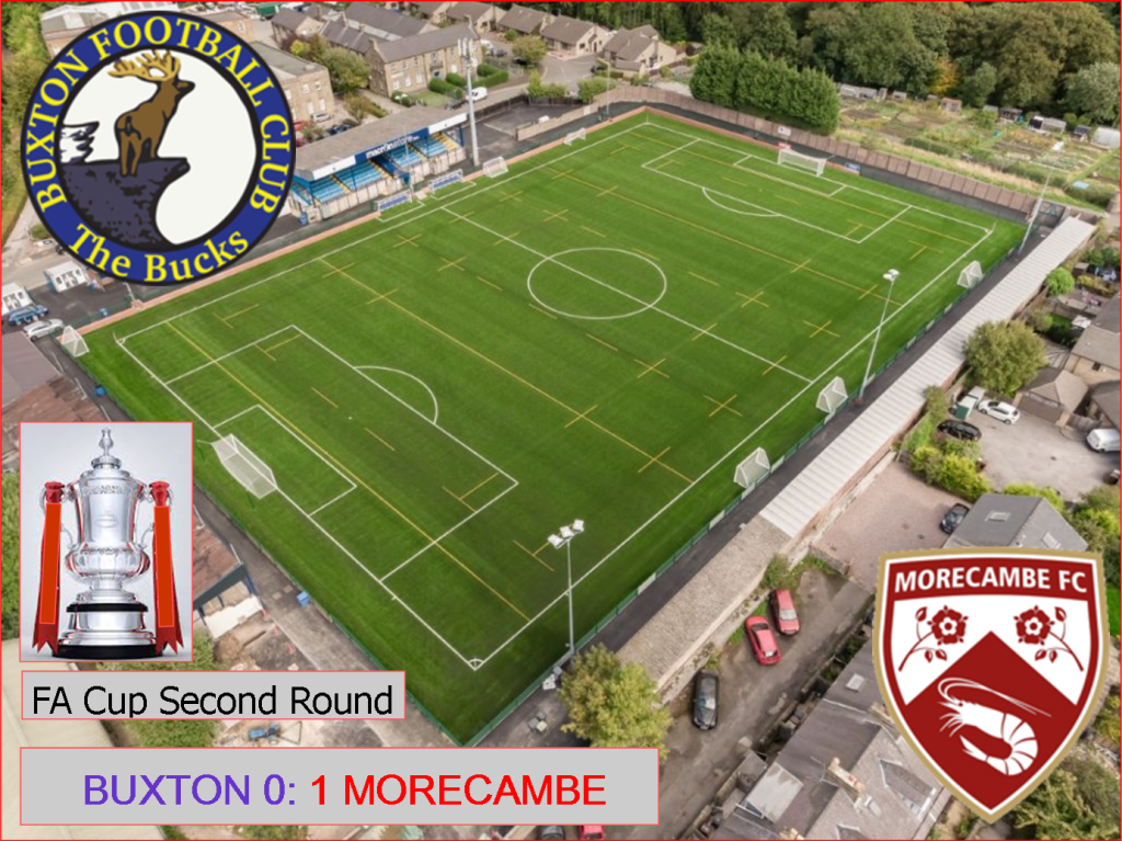 Morecambe travelled from the shores of the Irish Sea to the highest football ground in England (at one thousand feet above Irish or any other sea level), the Silverlands today. At Buxton’s tidy little ground on the outskirts of this picturesque Peak District Spa town, they would face the club which led the Northern Premier League until a week ago in the Second Round of the FA Cup. This is only the third time that the Bucks have reached this stage of the competition. They drew 2-2 against Barrow in the Bluebirds’ original incarnation as a League club in 1962 and then lost the replay 3-1 at Holker Street. They had already played at Peel Park against the original Accrington Stanley four years earlier, where they were mauled by six goals to one.