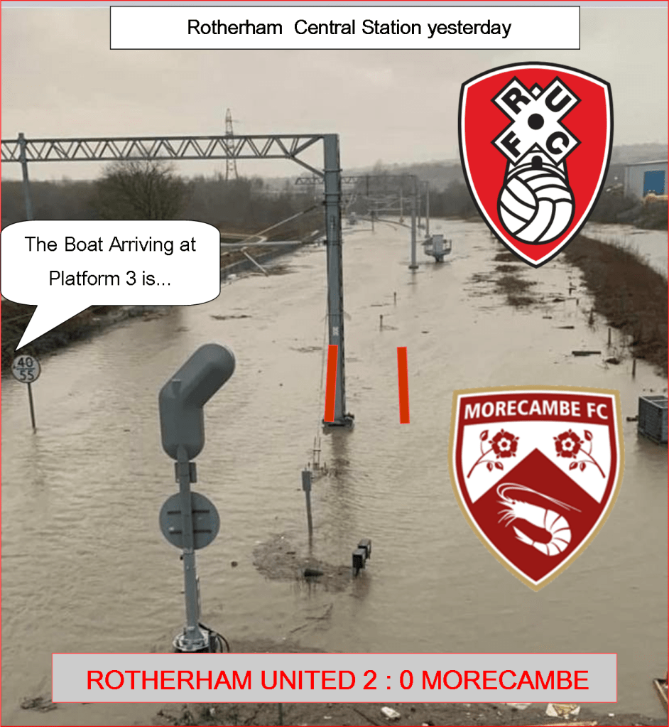 Whatever, the club visited the New York Stadium tonight facing an uncertain future. They went by coach – as usual. But anyone who wanted to travel to the town by train today would be sadly disappointed: Rotherham Central Station was still closed due to flooding caused by the successions of storms – Dudley; Eunice and Franklin – which have wracked the British Isles during the last few days.