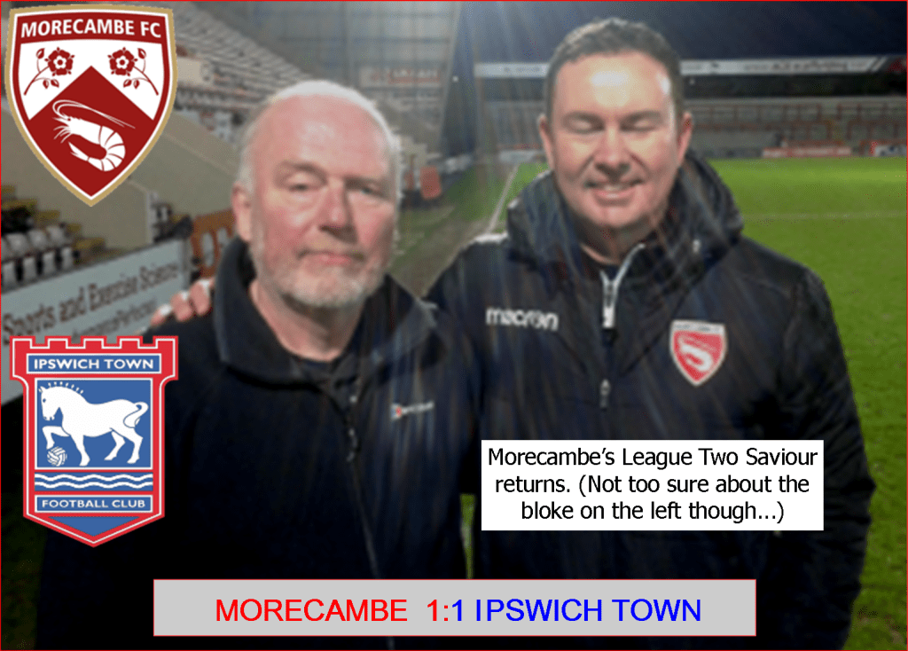 This is just the fourth time that the clubs have played each other. The first meetings occurred a long time ago when Morecambe was a non-league club and Ipswich was a member of the Premiership. Morecambe lost both FA Cup matches. But as we have seen, there is nothing between them as far as league games are concerned. The Ipswich Manager – implying that Morecambe’s renowned catering is not up to his high standards – said the following prior to the match: