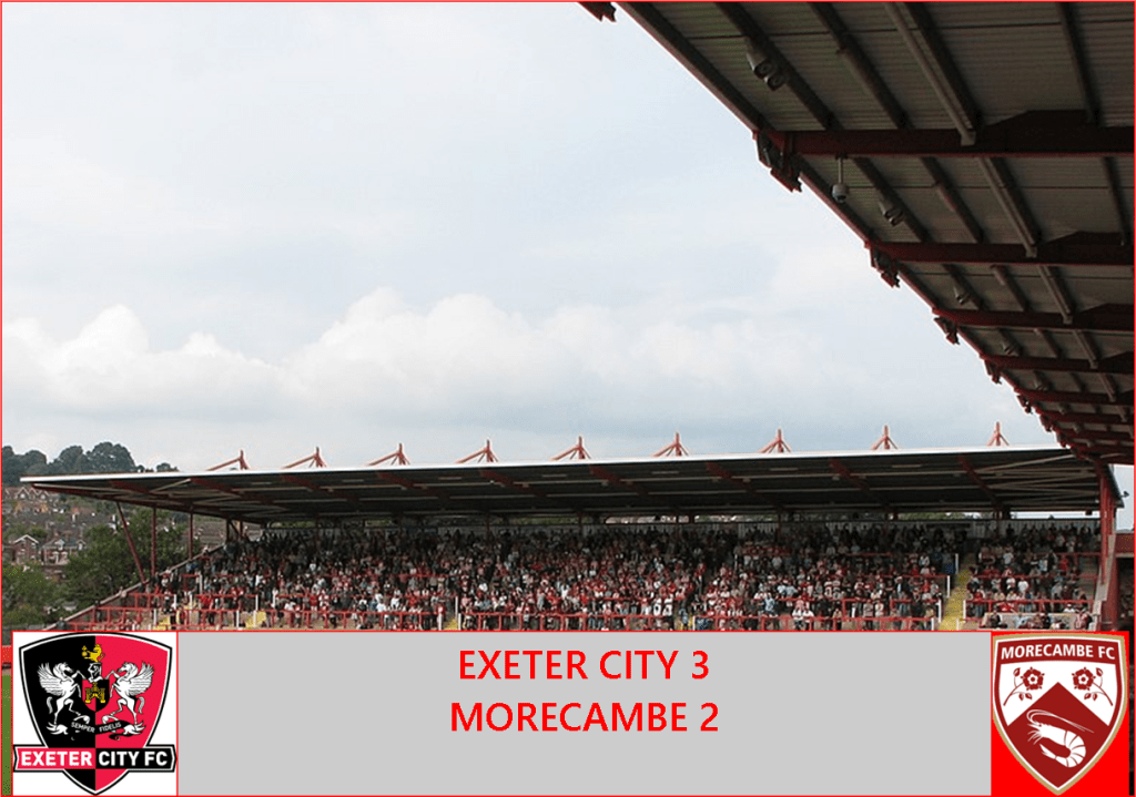 On Sunday, Morecambe’s remarkable late season form of three wins out of three – home and away – came to a shuddering halt as they lost by the odd goal in five at Exeter. In doing so, they were relegated for the first time ever in the Shrimps’ one hundred and three year history.