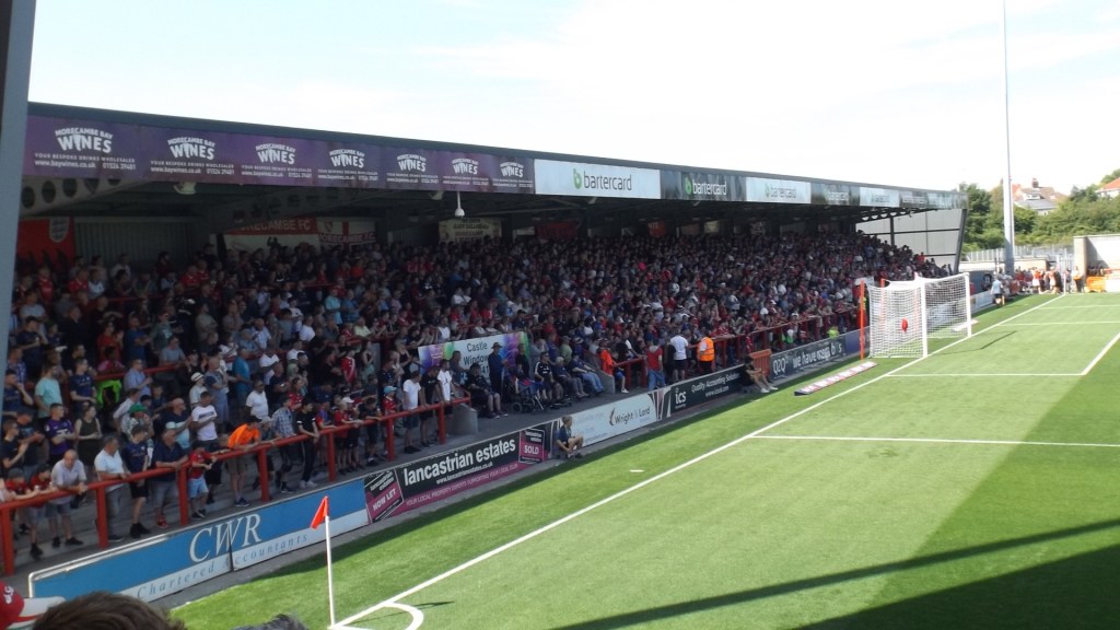 Morecambe’s geographically closest rival visited the Mazuma Stadium today for a League One fixture. Fleetwood were tenth in the table following a 2-1 win over Plymouth Argyle at Highbury last Saturday; a game that they came from behind to eventually win. Last Tuesday, Town also pulled off one of the shocks of the League Cup’s Round One when they beat Championship Wigan by the only goal of the game in another home match. In the past, The Cod Army – in various incarnations – have met Morecambe countless times in leagues as disparate as the Lancashire Combination and the EFL. As League clubs, though, the visitors had won four of nine EFL games and lost three. Last season, in their only previous League One meetings, Fleetwood drew at the Maz in a goal-less bore played in dense fog but then memorably lost 1-2 at home to perhaps the most amazing goal I for one has ever seen in real life. Cole Stockton’s powerful turn in his own half when under pressure followed by a perfect lob over half the length of the pitch during injury time will live forever in the memory.