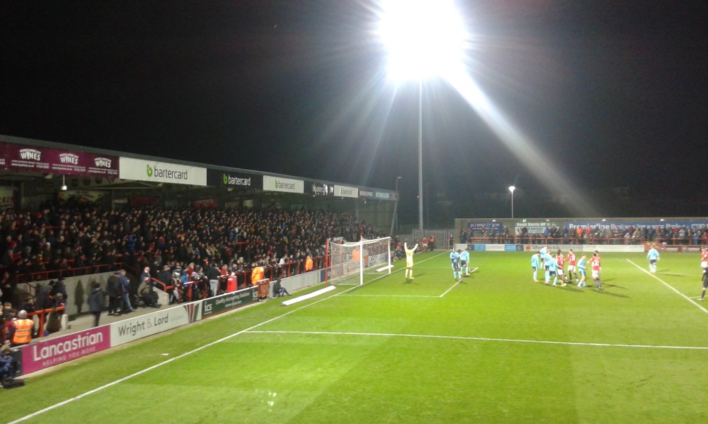 Exeter had to make the very long journey from Devon to North Lancashire today to play a game which was originally scheduled to be played tomorrow. This is yet another downside of FIFA’s comprehensively corrupt decision to award the World Cup tournament at to a dodgy country where money speaks far louder than any other of the many objections to the reality of a state whose laws and values are rooted in the Dark Ages. To play the World Cup at a time when the major leagues of international football have to be interrupted to allow for this is a decision that makes no sense at all except to those members of the ruling clique who have benefited from it personally in terms of large wads of cash. It stinks, in fact. But the knock-on effect tonight was that many Grecian supporters would be logistically unable to travel and get home again in a reasonable time all because the England team were originally predicted to play a World Cup match tomorrow afternoon. (Just to rub things in, it turns out that they will not be playing until Sunday in reality.) So commiserations but also congratulations to all the two hundred and fifty-five fans from the south coast who actually made the long journey (287 miles) to the Mazuma Stadium tonight to support their club. Many of these people would have had to shuffle their work routines – if this was even a possibility – to leave the city centre today at noon. Return coaches are due to arrive back in Exeter at just before four tomorrow morning. Both of these things are ridiculous – and shouldn’t have happened in the first place. I wouldn’t be happy if the boot was on the other foot – and I’m sure they aren’t either.