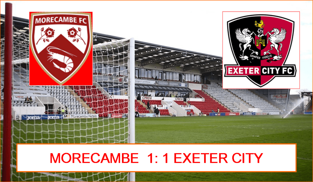 So that was it. Morecambe looked like they were going to win this game early on but finished up being thankful to escape with a point. They were so poor in the second half that it actually came as a shock to the senses to fleetingly see them in the Exeter half after all of 83 minutes. Why on earth King Derek waited until three minutes from time to send on Kieran Phillips to attempt to break the stalemate is something only he could explain. However, the single point his team clung onto tonight was enough – for a few hours at least – to push the Shrimps up to twenty-first position in League One. Worryingly though, they are now five points adrift of safety. Exeter, meanwhile, moved up – probably temporarily as well – one place to tenth. Derek Adams is always realistic but also emphasises the positive in all situations. Tonight, he had this to say after the game:
