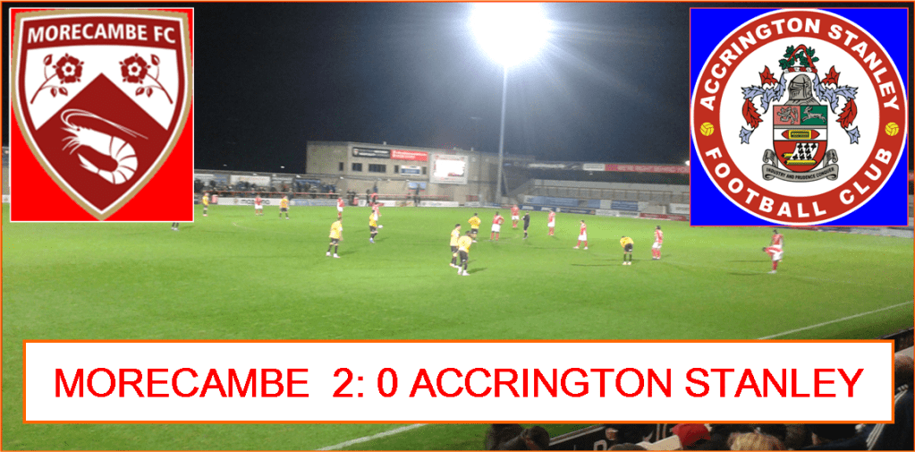 Accrington Stanley travelled from East Lancashire to the Irish Sea coast in the north of the county tonight to face bottom of the table Morecambe in League One. Stanley are without any doubt the Shrimps’ all-time Bogey Team. They have faced each other twenty-six times altogether in the EFL so far and Morecambe have only won a truly feeble two of these matches. Stanley have won an astonishing fifteen, most recently in the reverse fixture in October when they ran-out comfortable winners 3-1 against the Shrimps’ ten men (Arthur Gnahoua was sent-off just before half time for a stupid and unnecessary foul on Mitch Clark.) Last season, having raced into a 0-2 lead at the Crown Ground, Stephen Robinson’s team once again capitulated and conceded two goals to finally draw the game – a reflection of the earlier match at the Maz, which ended three goals each.