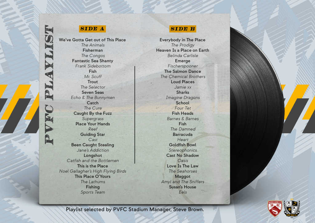 Tomorrow, Vale would have brought over one thousand fans with them from Burslem. Their Stadium Manager, Steve Brown, concocted the Playlist shown here for them to listen to on their way. Ignoring the fact that there’s actually an `i’ in `Plaice’, can you see the link in either the song titles or performers?