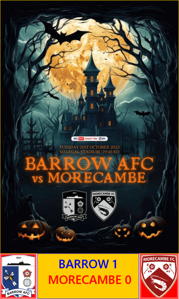 Morecambe crossed the bay to Barrow-in-Furness this Halloween to take on a team which has not been beaten in six previous League Two games at House of Horrors Holker Street. The two clubs have met loads of times over the years in various leagues and Cup competitions. But since the Bluebirds re-entered the EFL from the National League under the leadership of the appalling Ian Evatt three years ago, they have played just three times. The most painful of Barrow’s defeats so far this season must have been when Evatt’s Bolton Wanderers knocked his former club out of the League Cup by the only goal of the game away from home last August.
