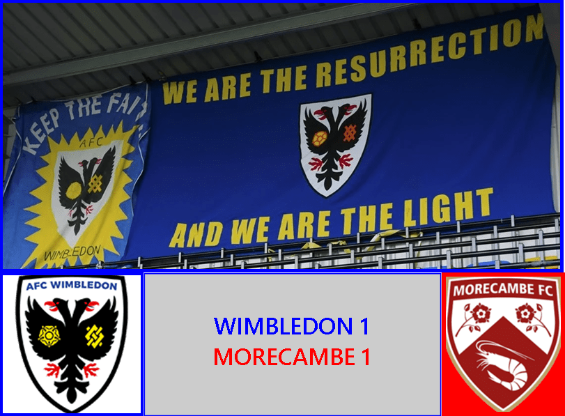 Morecambe thus remain unbeaten in four games and maintain their very impressive recent unbeaten away record. Both clubs benefited from the single point today: Morecambe took over the Wombles’ previous tenth position; the Dons themselves went up to eighth. Both are just one point off Harrogate in the lowest of the Play-Off places but with Morecambe’s re-arranged game at Walsall scheduled for next Tuesday, the Shrimps could very well find themselves in the rarefied atmosphere of the Division’s elite by Wednesday morning.