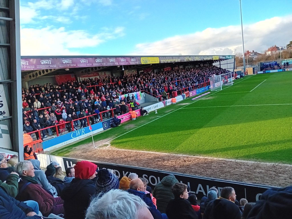 Morecambe started sluggish and disorganised at the back and played some disjointed, ineffectual football for most of the first half. Yann Songo’o forced visiting stopper Harvey Cartwright into a routine save after six minutes with a shot from distance. Then Jordan Slew – who was again lively all game – had a good shot deflected for a corner after 20 minutes. Then the visiting goalkeeper had to palm away a thunderbolt from deserved Man of the Match Gwion Edwards after forty. And that was the sum total of the Shrimps’ endeavours before half time.