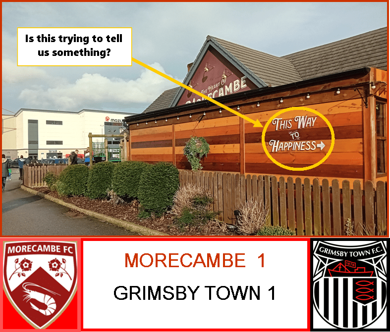 At the end of the day, Morecambe were perhaps a little lucky to hold onto a point because the visitors had at least two decent shouts for penalties during the second half. Dave Artell – whose gesticulations from the side lines particularly in the first half didn’t do him any favours and were the mark of a man under severe pressure – will probably still be in a job on Monday. The Referee – Will Finnie – will be too, which is a shame: he was pathetic today; both officious and weak at the same time. But, given favourable results elsewhere (Harrogate lost at home 0-2 and the real Dons were surprisingly beaten 2-1 at Doncaster), Morecambe found themselves a place higher in the table at the end of the game than they had been at the beginning. Grimsby remain twenty-second but – with Forest Green beating Tranmere 1-0 in Gloucestershire – are only four points above the Drop Zone tonight.