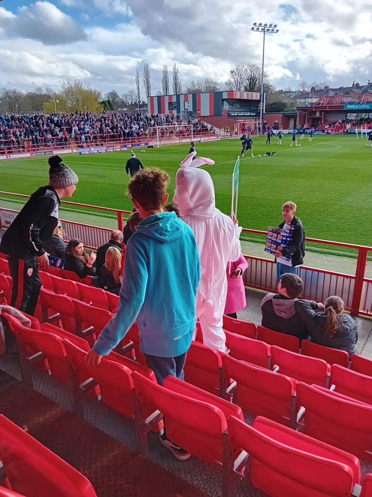 At the Crown Ground, we sat at the back of the away stand almost on the half way line as sunshine hot enough to burn you blazed down from a predominantly blue sky. A really nice touch then ensued before kick-off: the Easter Bunny arrived to give even the kids from Morecambe good quality Easter eggs and a chance to be photographed with the creature responsible for this sweet treat. Well done to the club for making this very thoughtful gesture – two little lads near to us were obviously absolutely thrilled by it…