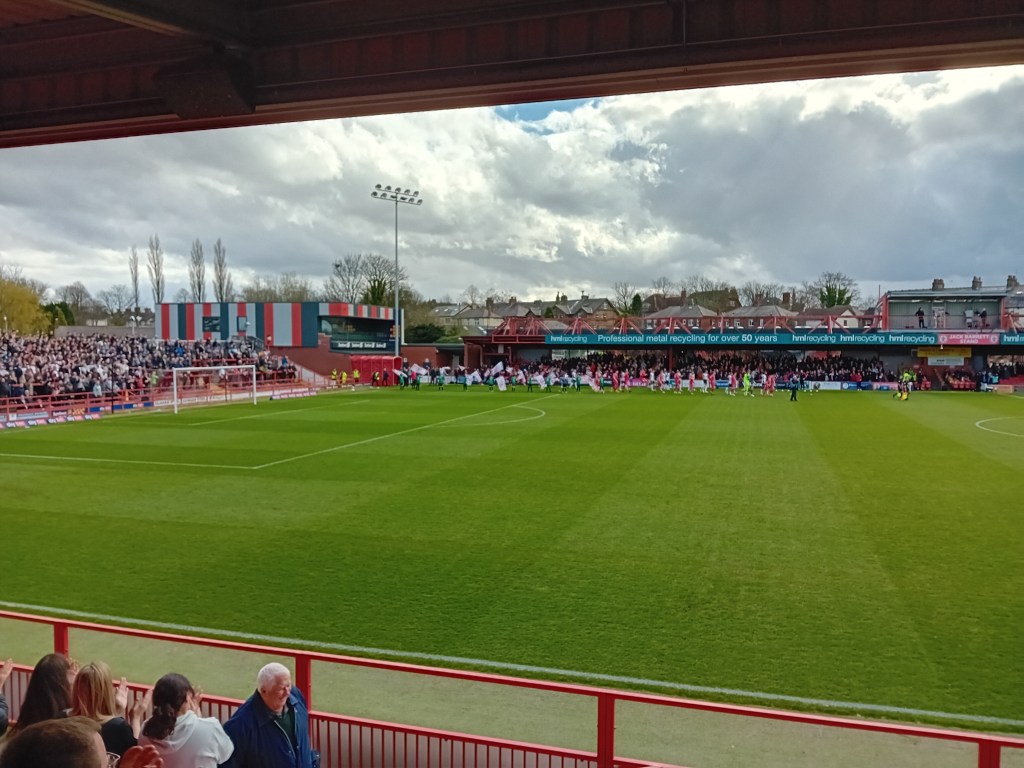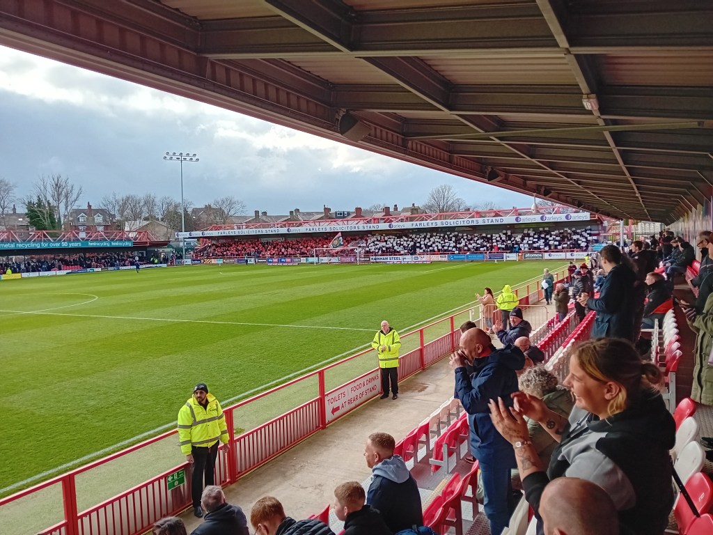 As the half had worn on, the weather changed from Spring back to Autumn. Dark clouds gathered over the Crown Ground from which freezing rain soon cascaded over the Morecambe fans on the open end terrace. Even those of us taking shelter in the away stand by the side of the pitch got wet as powerful Pennine gusts blew the deluge across the field almost horizontally towards us.