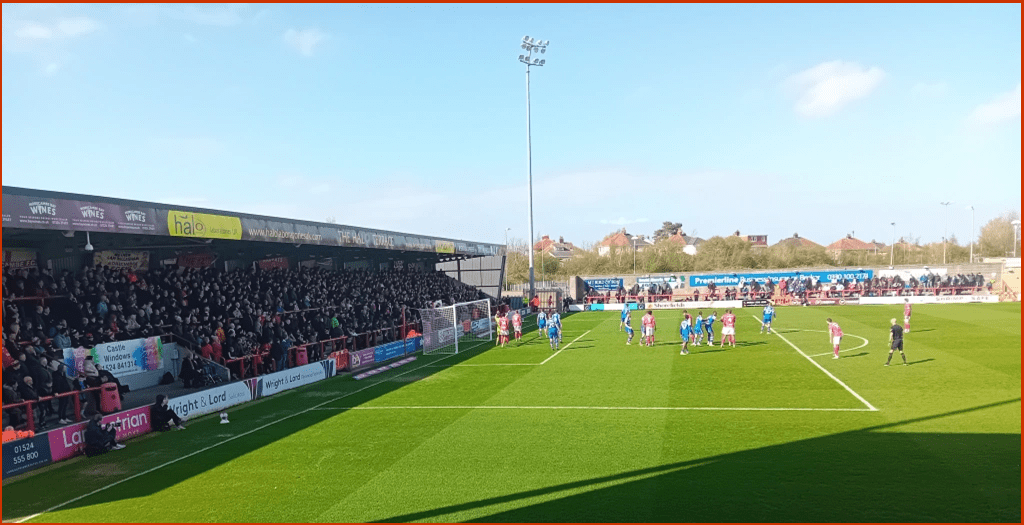 For Morecambe, another win to add to the six points they earned against local rivals Accrington Stanley and Barrow over Easter was just as imperative. The Shrimps were in eighth position in the table this morning, just two points adrift of Crawley at the bottom of the Play-Off pack. A win for them today and defeat for the Sussex club against Mansfield in Nottinghamshire – a result which was well within the realms of possibility – would see them exchange places. (As it turned out, Crawley easily turned-over one of the best teams in League Two and ran out 1-4 winners.)