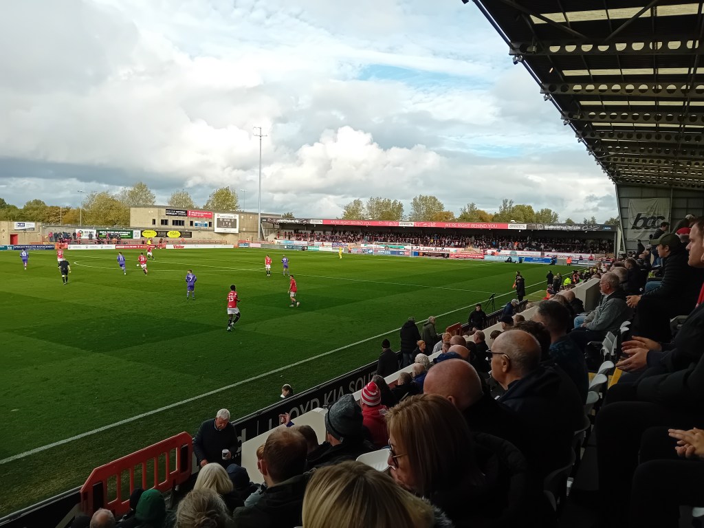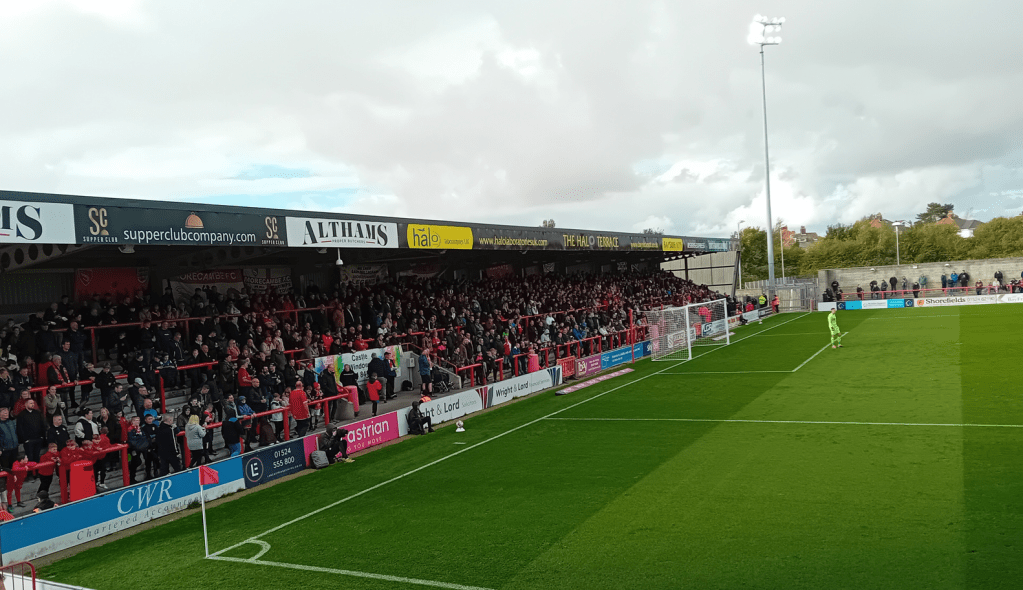 Well – I said that if Morecambe started the game the way they finished against Fleeetwood, County would be in for a torrid time. And so it proved. Derek changed his usual choice formation – one forward playing alone up-front – and paired Lee Angol and Marcus Dackers to lead the attack. At the back, full-backs David Tutonda and Ross Millen backed-up new Captain Jamie Stott at Centre Half and deserved official Man of the Match Adam Lewis was shoved into midfield. He had a brief to keep an eye on Dan Crowley and create chances by his own dynamism. He did brilliantly well, for instance, to slide in and dispossess Morecambe’s former midfield Maestro, take the ball forward and have a shot on goal which was just off-target with 26 minutes on the clock.
