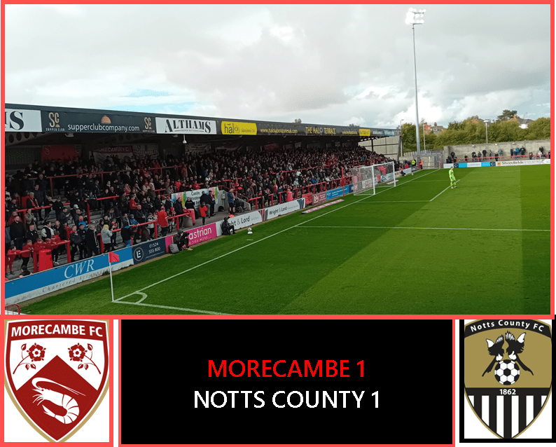 Morecambe welcomed Notts County to the Mazuma Mobile Arena today hoping to record their first three points of the season. Rooted right at the bottom of the entire Football League, the Shrimps have only two points to show for their seven games so far. These points have been won the hard way though: 1-3 down against Colchester last time at home but battling back to 3-3 with only ten men. Last Tuesday, they looked dead and buried at Fleetwood at half time – two-nil down and being run ragged at times. But Derek Adams shook things up at the break and his men came battling back to draw the game 2-2. If they play like that today, they will give the high-flying Magpies a run for their money. But if they play like they did in the first half at Highbury, well…