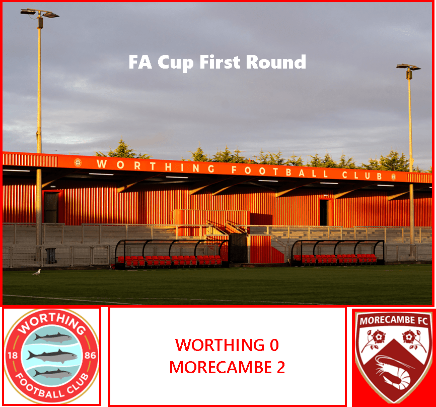 Worthing gave a good account of themselves and regional National League football today. They repeatedly played the ball out from the back constructively and there was no Kick-and-Run or aimlessly booting it long from them at any time. But their FA Cup Dreams were shattered for at least this season by a team which just had a little more nous on the day then they possess. So – despite the gloomy predictions of some pundits – Morecambe’s name goes into the hat for the Second Round on Monday night. Perhaps also just as importantly, the match fee for the win (£45,000) also finds its way into the Shrimps’ paltry coffers to double their winnings from Cup competitions so far this term. This is what King Derek had to say about it all once the match was over: