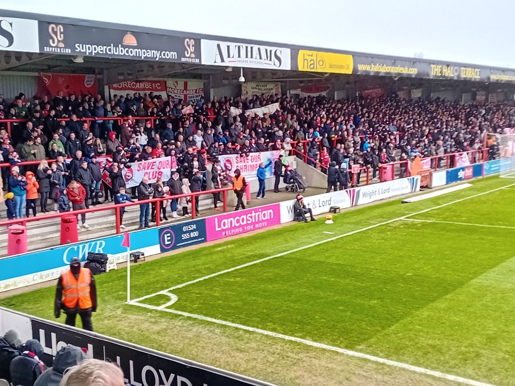 This was a game where there was barely a wafer-thin mint between the two teams. Neither Morecambe’s current goalkeeper – Harry Burgoyne – or their last one – Connor Ripley – were particularly busy throughout a match which never failed to be good to watch. To their considerable credit, the league leaders had clearly come here to win the game. There was no diving, feigning injury or time wasting from them even after they belatedly took the lead.