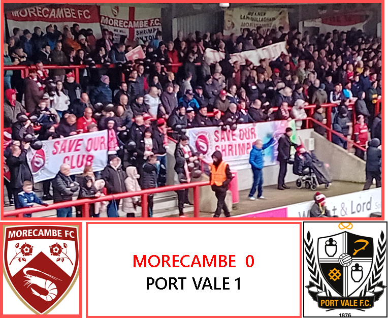 Defeat was barely what Morecambe deserved but Vale took their golden chance when it arrived – and Morecambe didn’t. The win pushed the visitors five points clear of the chasing pack tonight. Morecambe obviously stayed bottom but – with Carlisle and Swindon both drawing away from home and Colchester getting a point at home against Bradford City, the Shrimps’ plight at the bottom of the EFL got ever so slightly worse. But still only three points separated them from safety and if they continue to play as well as they did this afternoon, there is good reason to hope that they will still be able to escape the Drop Zone by the end of the season.