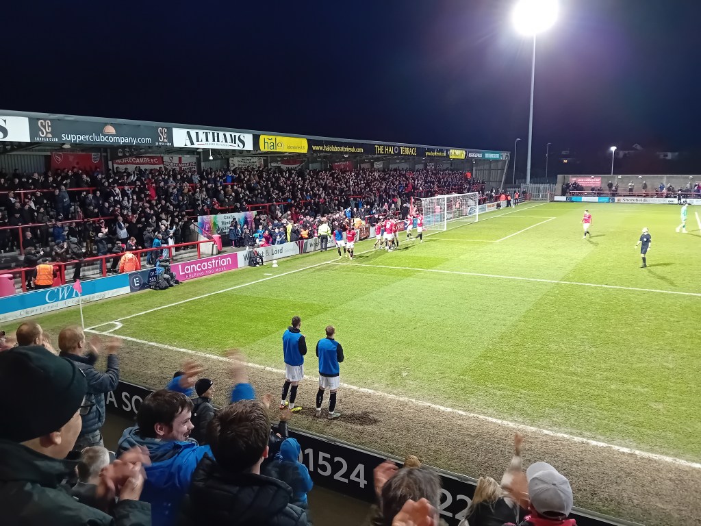 And that was basically that. As the home fans taunted the visiting supports with loud chants of “There’s only one Derek Adams!”, ten-man Bradford won a couple of corners which came to nothing late on in the game. In truth, though, the home goalkeeper had little to do and no shots to save as the Morecambe rearguard dealt well with what little threat the visitors ever managed to muster.