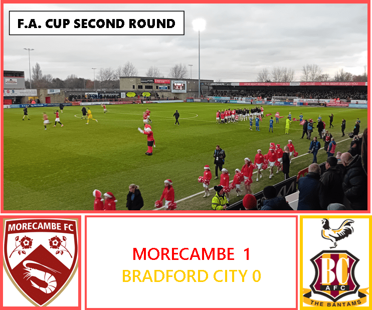 Bradford City visited the Mazuma Mobile Stadium for the second time this season to compete in an FA Cup Second Round tie today. The last time they visited – on October 1st – they came from behind late on to draw 1-1 in a League Two fixture. In previous meetings with Morecambe, the Bantams have won ten of 22 games in all competitions and lost five. City got to this round by beating National League Aldershot 3-1 at Valley Parade. Meanwhile, the Shrimps had travelled all the way to the south coast to meet National League South club Worthing, who they overcame by two goals to nil on the day.
