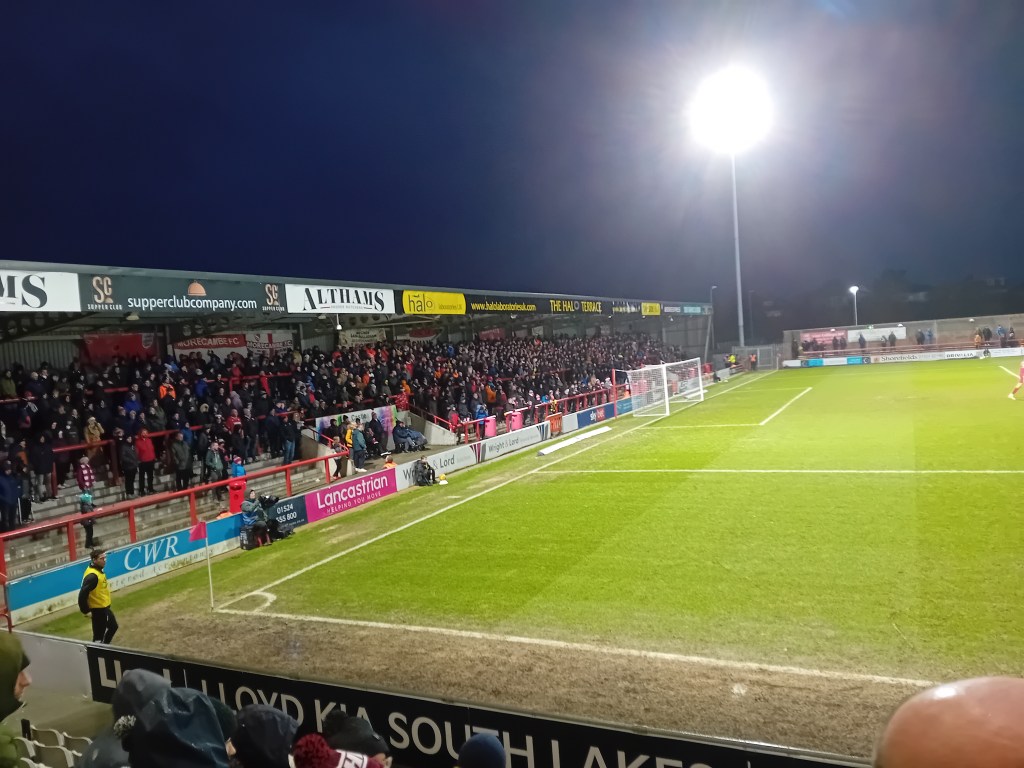 Morecambe welcomed Grimsby Town to the Mazuma Mobile stadium today. There was also another uninvited and unwelcome guest hovering on the fringes of the ground: Storm Darragh, who could give Stormy Daniels a run for her money any day of the week. It had already caused the game between Barrow and the plastic club from Milton Keynes – on the other side of Morecambe Bay not all that far away – to be abandoned.