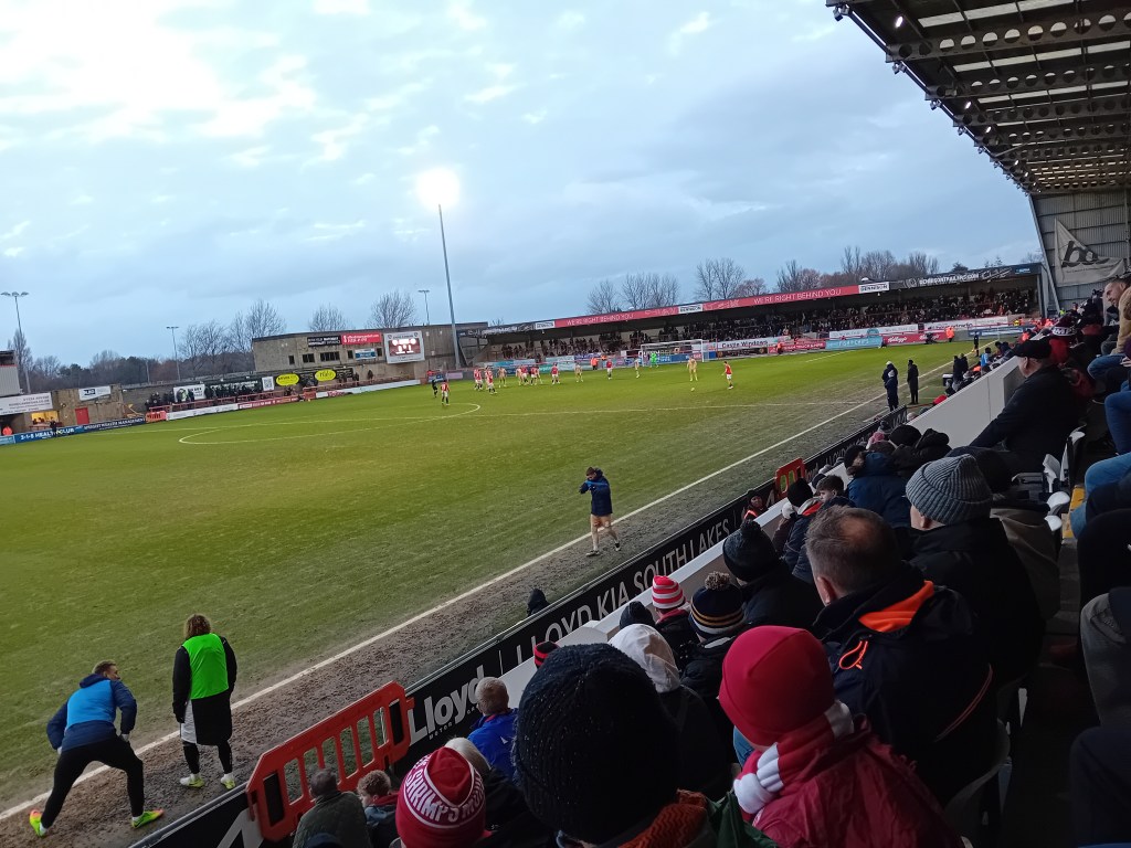 It was the shortest day of the year today, which is appropriate because this is going to be one of the shortest match reports I have ever written. I’ll start – as ever – by mentioning the weather conditions: windy and grey with occasional torrential icy downpours. I can tell you for certain that a really heavy rain squall swept across the ground at 3.34pm – the stair-rods of rain so dense that I could barely see the time on the scoreboard on the other side of the ground at the end of the pitch from where I was sitting.