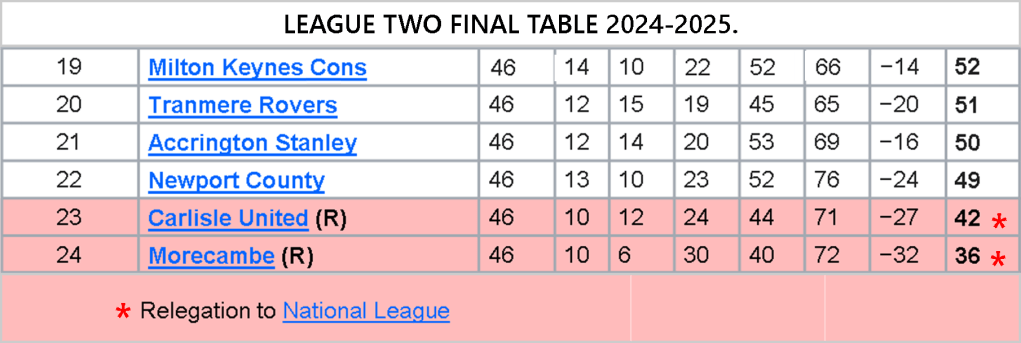 For the eighteen long years that Morecambe have been members of the English Football League, the club has always been the pundits’ favourite for relegation. When you consider that some of these self –styled `experts’ include beacons of intelligence, objectivity and vast knowledge of the game such as Dame Clinton “Articulatedness is a word!” Morrison, it’s no wonder they have been confounded over almost two decades. Only four years ago – and to really upset all the Bookies – Derek Adams led the worst-financed club in the entire EFL to the giddy heights of League One. But even Dame Clinton probably gets something right – like putting the correct shoe on the appropriate foot when he doesn’t have anybody to help him – from time to time and this year, the Bookies’ dire predictions of the last eighteen years have actually come true.