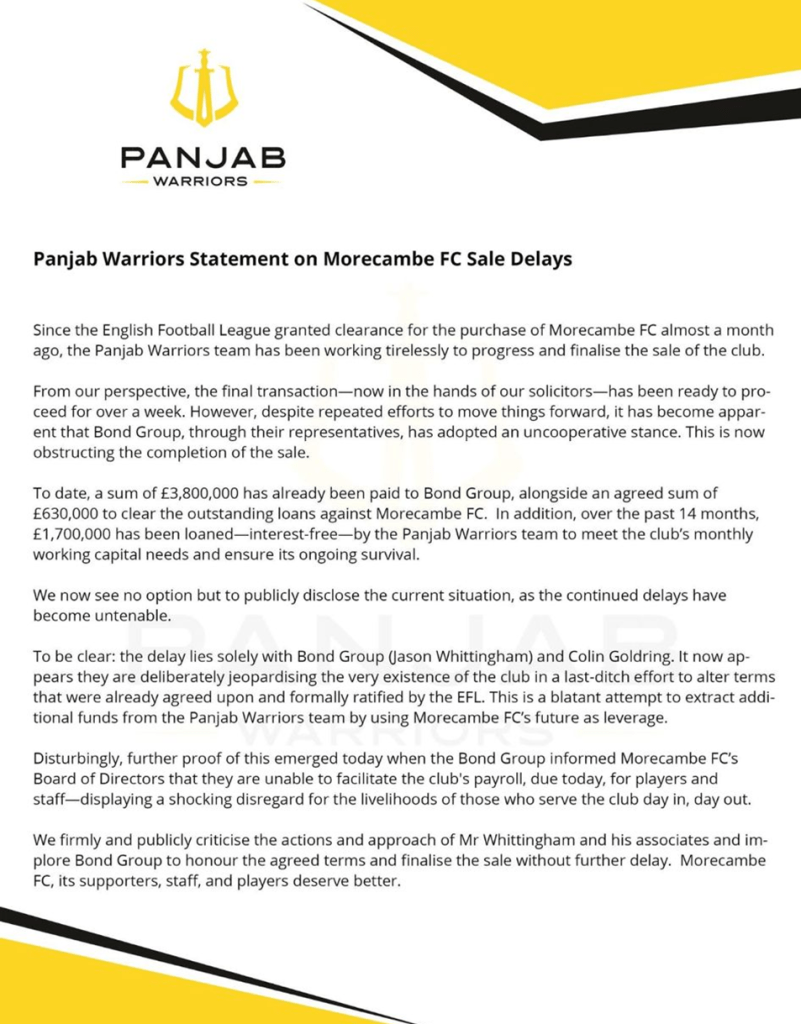 Within a very short time, Panjab Warriors responded with this even stronger indictment of Morecambe’s current owner: