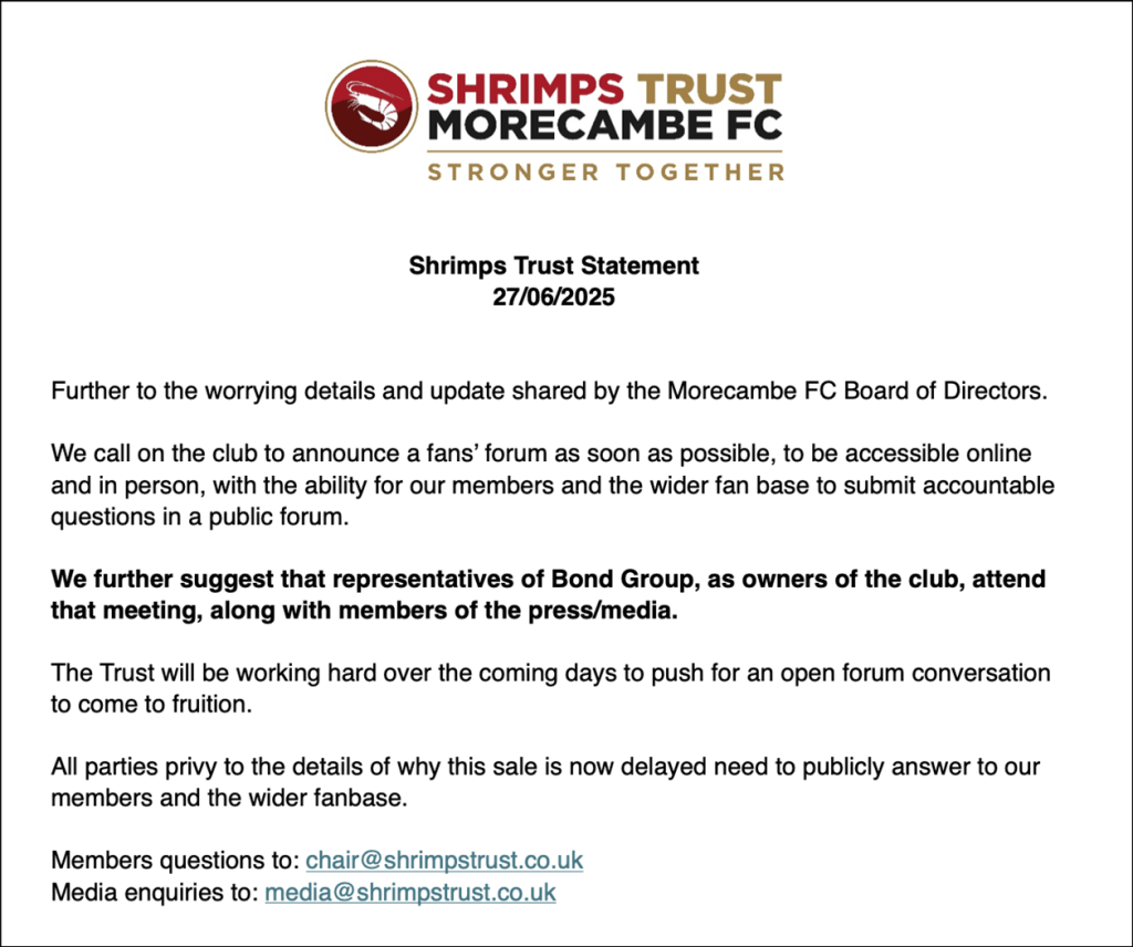 “The Board of Directors of Morecambe Football Club wish to make the following statement.