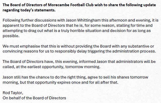 “The Board of Directors of Morecambe Football Club wish to make the following statement.