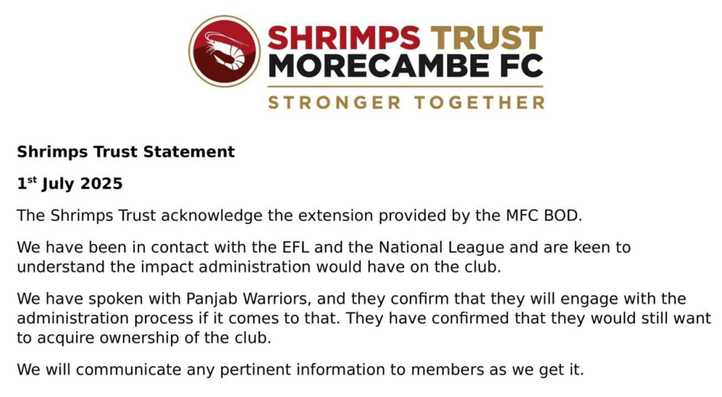 “The BOD (Board of Directors at Morecambe), the Owner, or a creditor are the only parties that can trigger administration. The Trust will ask the BOD at which point they will initiate this. Based on the disclosed information by the BOD and PW ( Panjab Warriors) about the position of the sale, and the unpaid wages, the Trust feel that it is time for the board to be transparent on the timescale they are working towards in relation to initiating administration.”