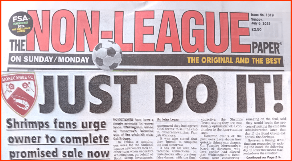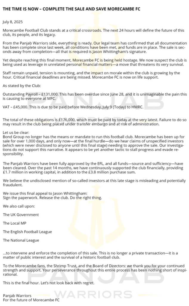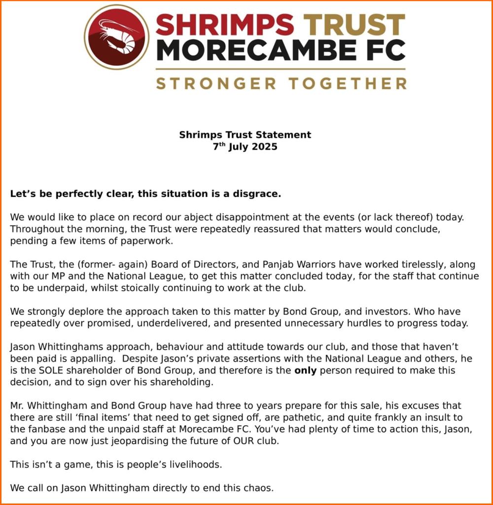 “Rod, Graham, Charlie, Mick and I have just met and agreed that we must remove ourselves as directors of Morecambe FC this evening, given that we stated publicly on Tuesday 1 July 2025 that unless a sale completed that day, administration was regrettably the only responsible option left to us.