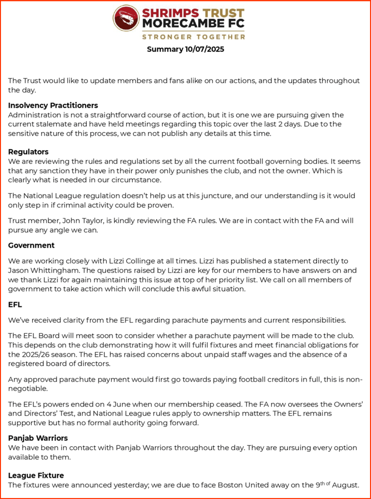 Last night (Friday, 11th July 2025), the Shrimps Trust put out a further message to its members to update everyone on the situation as it stands at the moment: