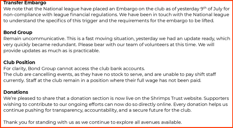 If this buyer is real, and is engaging with the National League, the process of approval can take 10 days after all paperwork has been provided. This doesn’t solve staff wage issues now. And as we know with Bond Group, a deal could be dragged over months. The club also doesn’t have a Board of Directors, and if our former board does not return, new directors will have to pass the testing, to be appointed to the club, to then be able to finalise a sale.