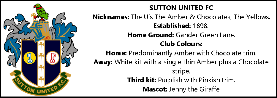 Confusingly, there are two Sutton United football clubs in England: one is based in Sutton Coldfield and plays in the Midland League. But the Sutton United we are interested in was formed in what was then Surrey during1896 as a result of the amalgamation of two other clubs: Sutton Guild and Sutton Association Football Club. The new club initially chose to wear the colours of the latter and the choice has stuck as evinced by their Amber and Chocolate striped shirts. So if Morecambe are the Reds and FGR the Greens, we now know which club completes the Traffic Light sequence in the National League, don’t we?