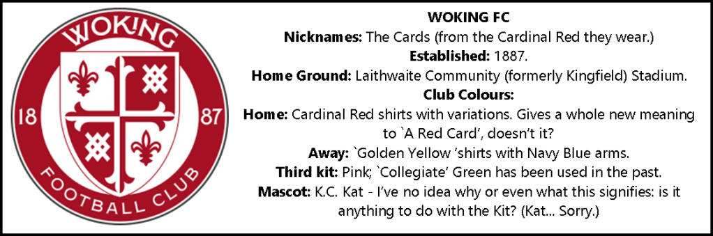 Woking moved to their present stadium during 1922. Let’s hope it doesn’t rain when we visit because – just like at Forest Green Rovers – away supporters get wet. (Even though the precipitation is presumably Vegan and probably organic as well at the New Lawn…) But the Laithwaite Community Stadium boasts a feature which a lot of (maybe all) football clubs should adopt: a small portion of the stadium known as Moaners’ Corner. (Just think: we could abolish the Morecambe Fans’ Forum altogether and just use that instead…)