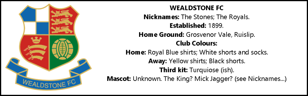 Wealdstone FC is currently a semi-professional club which has its roots in what was once known as amateur football in this country. As we have mentioned previously, amateur football and snobbery have always gone hand-in-hand in England. So it’s appropriate that when they were founded in 1899, the club was initially based in Harrow at the Lower Mead ground, not too far away from the awfully posh school there where young gentlemen from the genteel Home Counties play equally genteel Rugby Union football. (These splendid chaps would not be seen dead in a `professional’ Rugby League shirt because that game is so frightfully rough, common and – shudder – Northern, don’tchaknow? )
