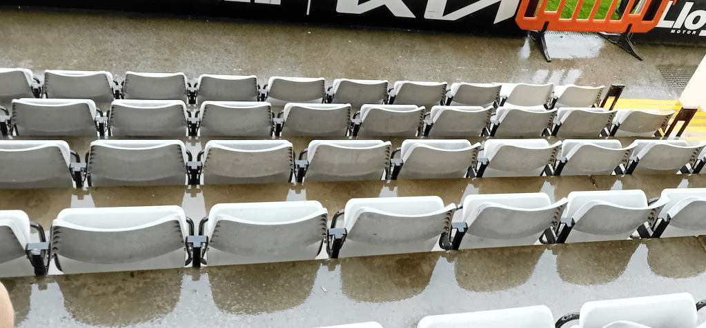 The weather in north Lancashire has been appalling this month. Fields which were virtually baked by a long-terms drought just a few weeks ago can now be found underwater right across the area as streams and rivers burst their banks and the heavens show no signs of brightening up. Today dawned wet and a bit misty – and got worse as the day grew older. This was the scene at half-time as fans abandoned the front rows of seats in the Main Stand because of the atrocious conditions: