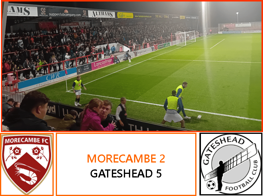There’s not much more to say. As Gateshead probably took their collective feet off the gas, substitute George Thomas scored a good – and determined – goal for the Shrimps after just over half an hour. So it was 1-4 at half time but the game had clearly long gone as far as the men in the red shirts were concerned. As some of the home crowd jeered them, the Shrimps came back on in the second half and actually played some neat football in the Gateshead half at times. But the visitors scored again in the seventy-second minute, through Pani once more. Payne than reduced the arrears with a lovely volley in injury time but the visitors had spurned several more chances and could probably have run-up a cricket score if they had really wanted to.