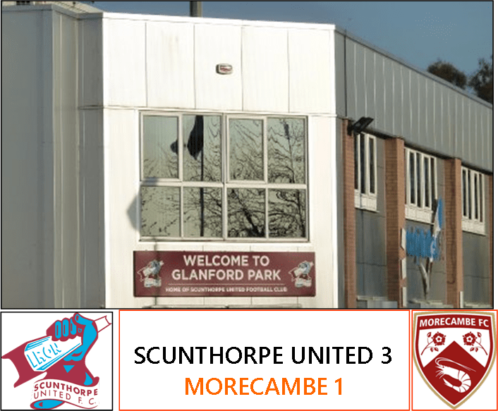At the same time, even higher-flying Scunny were losing at home to Carlisle United, 0-1. They had Skipper Andrew Boyce sent-off before half time and were apparently lucky to end the game with ten men after Will Evans appeared to use his elbow on a Blues’ player in first-half stoppage time. The defeat was the first one of the season for United and the 25 points they have accumulated after twelve matches has placed them comfortably in the Play-Off positions in the National League in fifth place. So – given Morecambe’s lowly position right at the bottom of the table coupled with their utterly dire history as far as the Iron is concerned –the Shrimps could be in a for a torrid time this evening. As we have seen, in six previous meetings in all competitions, Morecambe have only been victorious once (a 4-1 home win in Scunny’s farewell season to the EFL) and have lost three of them. They have never won at Glanford Park either.