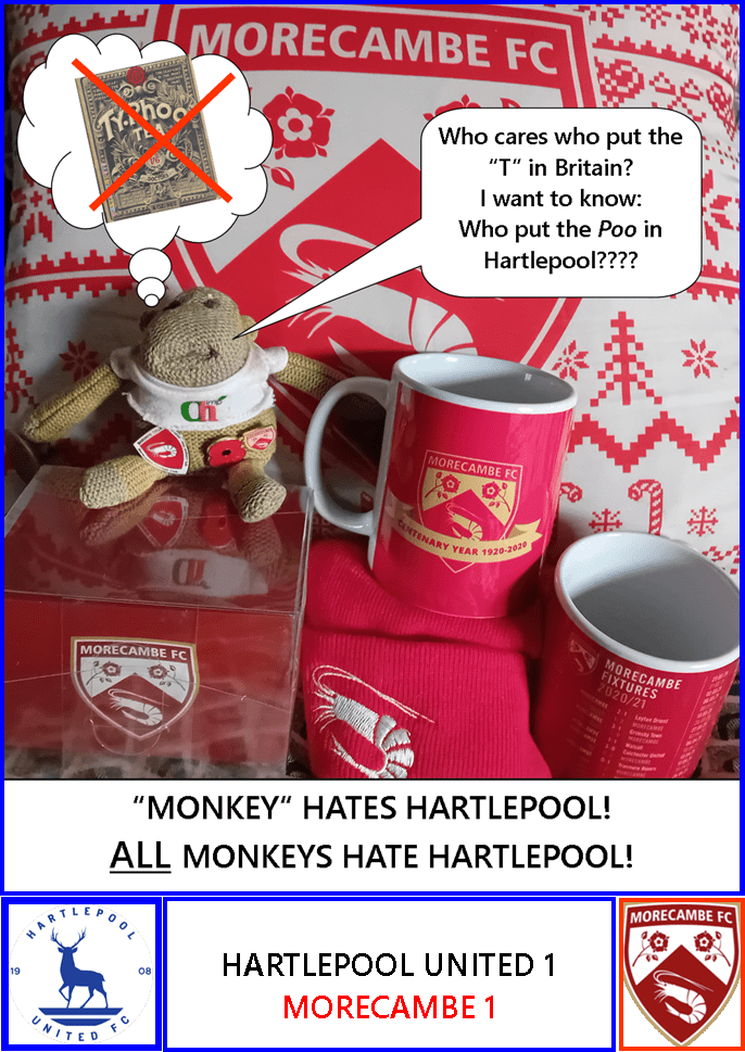 The Pools started tonight’s game in tenth position in the National League, having sacked Simon Grayson last month after he had guided the club to just a single win in eleven games. He lasted precisely four months in the Hot Seat at the Victoria Ground. Since then, things have hardly improved. The Monkey Hangers have been dumped out of the FA Cup by non-league Gainsborough Trinity; humiliated by the Northern Premier League side 1-3 in front of their own supporters in County Durham in a replay which they were expected to win easily. In their last game, though, they won for the first time in six matches; beating Solihull Moors 2-0 (with an opening goal from former Shrimps’ striker Vadaine Oliver) at the same time that Morecambe were losing 2-1 at Eastleigh. Adam Campbell would also line-up this evening for them to play against a former club of his and one-time Shrimps’ stopper Adam Smith – the Goalkeeping Coach and reserve stopper for Pools – would warm the bench tonight. His Wikipedia entry is fascinating: I daren’t repeat here what it says about his extra-curricular activities in Thailand in the `Personal Life’ bit – these were kept very quiet when he was on Morecambe’s books – as well they might be…