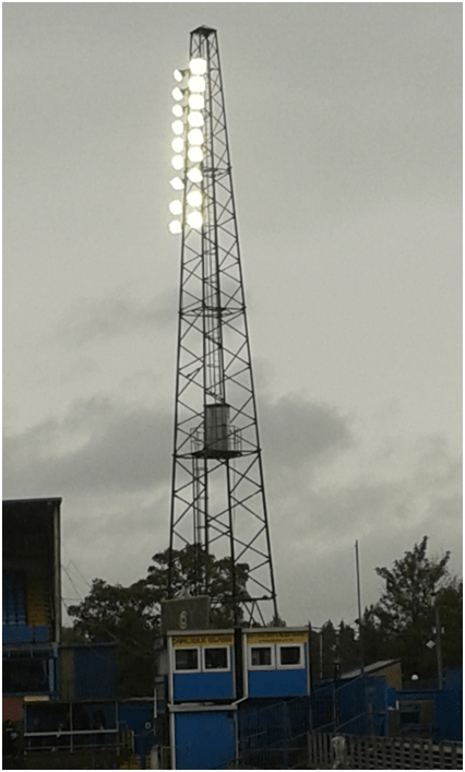 I’ve already mentioned that the ground looked dilapidated even way back in the 1970s. It’s not improved with age – where else would you find awful floodlight pylons like these, for instance? – it looks as if, unable to afford gantries for the light clusters at the top, someone has just attached them willy-nilly to the supports instead – or that the gantries have actually fallen off…