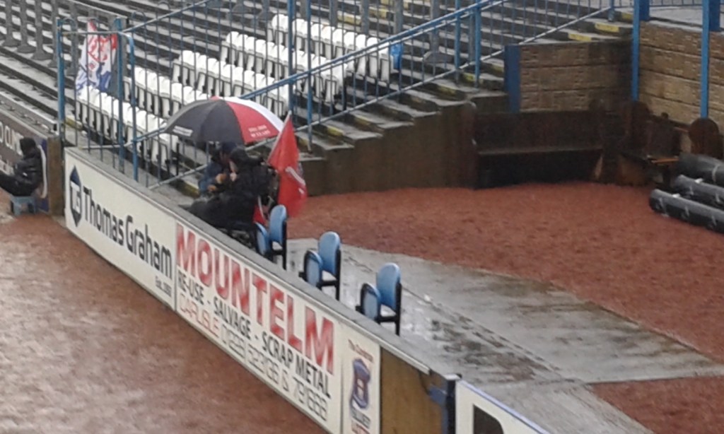 I went down to Brunton Park on the Monday morning after the match and I was assured that the Morecambe fans were, on three separate occasions, offered the chance to move to a dry area but they chose to remain in the uncovered area in the Waterworks End.