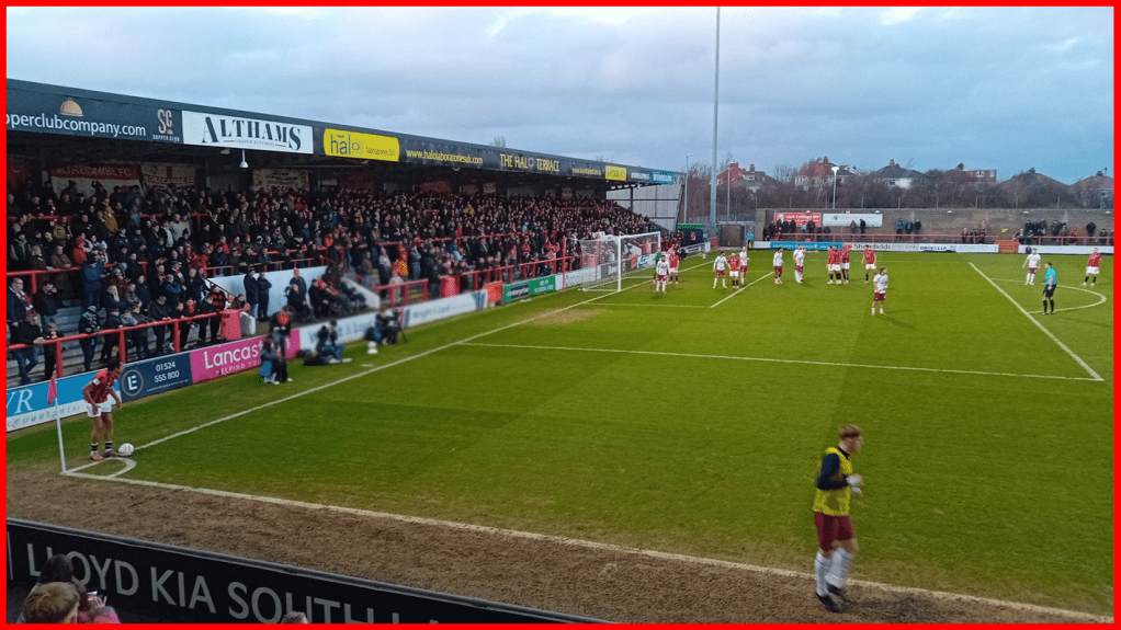Anyway… it was not a bad day weather-wise prior to kick-off in north Lancashire: dry with a bit of hazy sunshine and very little breeze. The pitch was quite heavy at the Maz but the game belied this by being actually really good to watch.