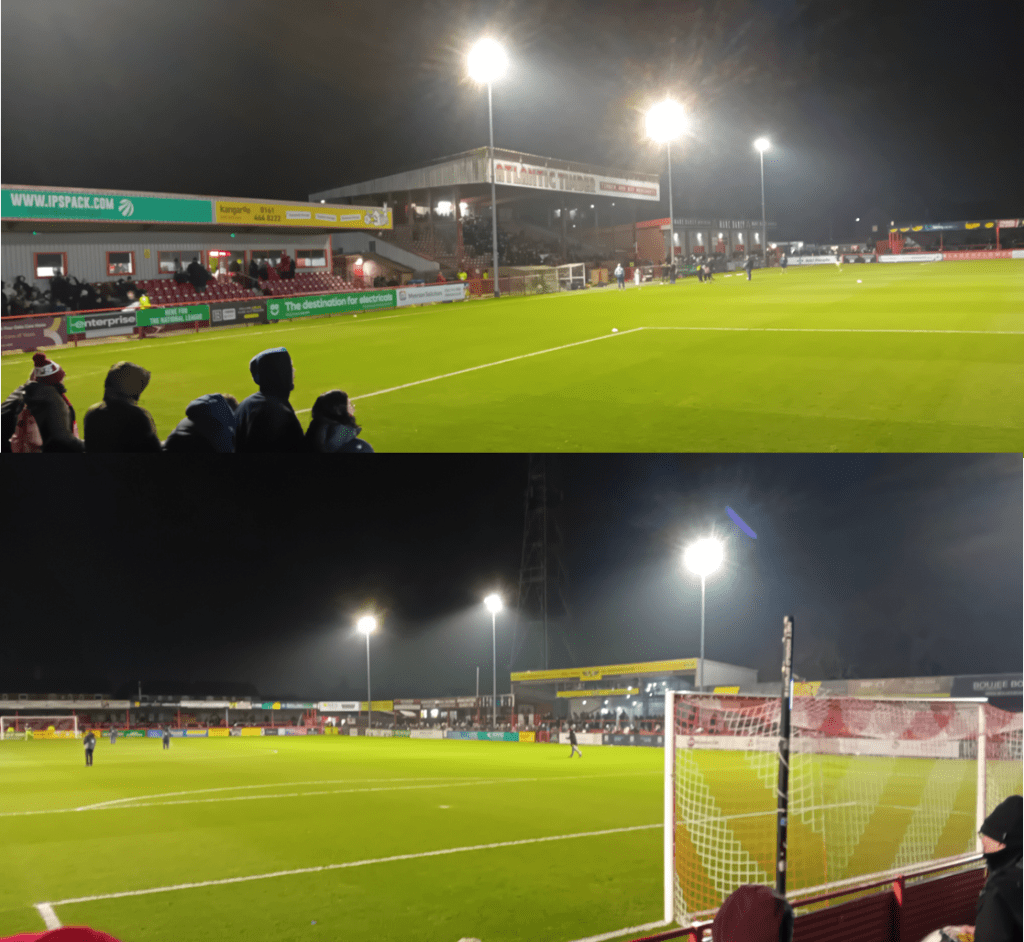 The second period started perfectly for the visitors. Josh Grant was perhaps lucky to receive only a yellow card after a sneaky foul off the ball on Popov to the right of the penalty area from Morecambe’s point of view. Azeez and Nolan lined up to take it; Jack actually hit it and swerved the ball around the Alty wall to the left of Hutchinson, who probably should have saved it – but didn’t as a tremendous shot went in right by his left-hand post.
