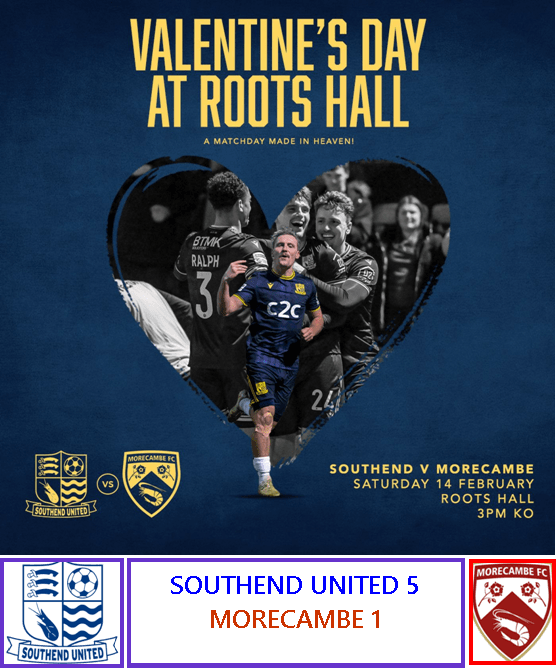 For Southend, Xmas came early today, St Valentine’s Day. Like buses – after years of frustration – not just one league win but a Double over the Shrimps arrived at Roots Hall today as the Shrimpers beat Morecambe there for the first time ever.