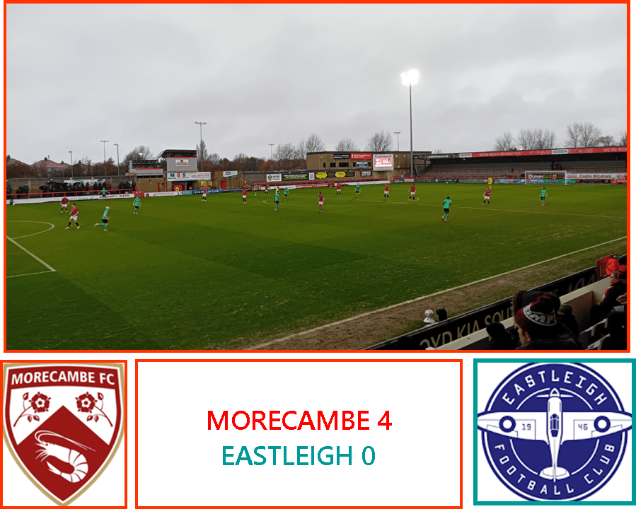 Morecambe, by contrast, have lost four of their last six league games and won none. Their latest game – at Southend last Saturday – turned into a rout as they lost completely spinelessly by five goals to one. They didn’t compete; they didn’t threaten – and too many of the side didn’t even try. Maybe they don’t care. Maybe they’ve given-up: it certainly looked like it. So the Shrimps started this afternoon’s game nine points shy of safety as only Gateshead lay below them at the very bottom of the table.