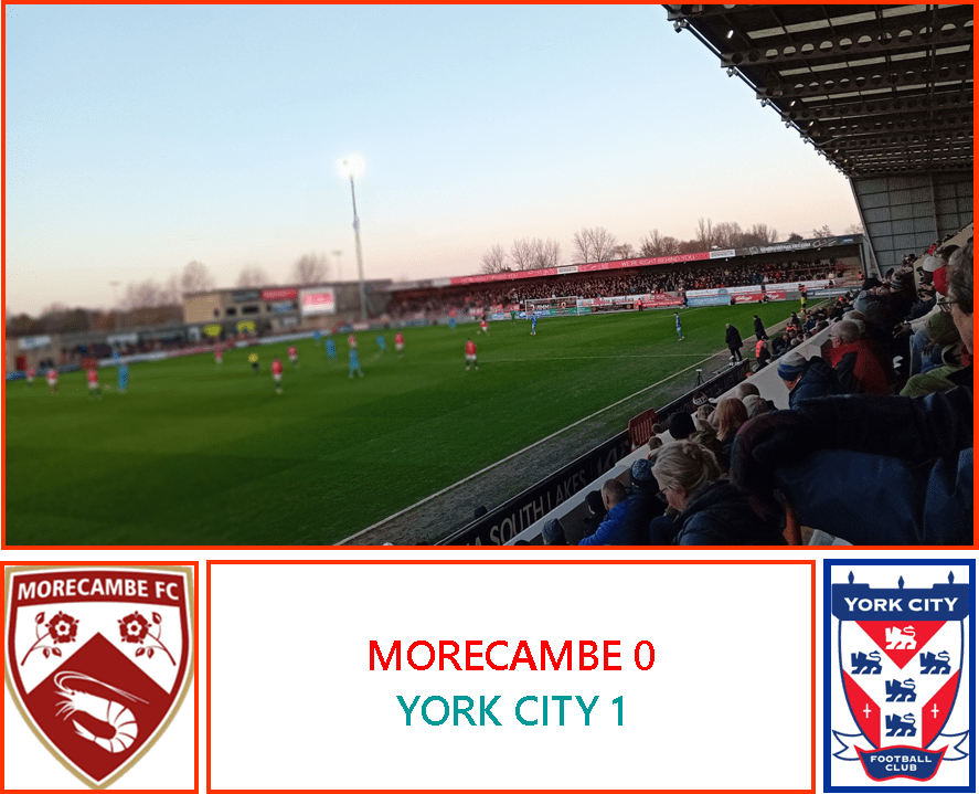 Old acquaintances were renewed at half past five this afternoon as ancient foes York City visited the Mazuma Mobile Stadium for the first time in ten years. The Yorkshire club have an excellent record against the Shrimps: six wins out of the seventeen meetings in all competitions I have identified and only one loss: the crucial Play-Off semi-final in 2006 which saw Morecambe promoted to the EFL after the Final against Exeter. Earlier this season, Ashvir Singh Johal’s usually hopeless Morecambe gave City a scare at their own place by going ahead but then proved why the RSPCA should ban him from ever owning a dog (inability to hold onto a lead) before Normal Service was resumed and the Minstermen won 4-2.