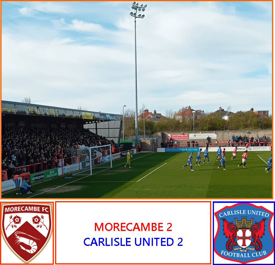 “If any match ever could be truly described as a six-pointer, today’s was it. Carlisle are the only club in the entire EFL between Morecambe and the abyss which leads to the National League. They have both played forty-one games so far; Carlisle have 34 points and Morecambe just two points more. In the reverse fixture last December, the Shrimps actually won at Brunton Park in a game where Jon Mellish was sent-off: a dismissal which was later rescinded by the authorities – much good did this do United at the time. But Morecambe’s record overall against the Cumbrian club is generally dire: they have only won five of twenty-four games in senior competitions and have lost twelve, not including their reverse against United last November at the Maz in the FA Trophy where Carlisle came from behind to win 1-2. With just five league games left to play this season, it was imperative for Morecambe to win again today.”