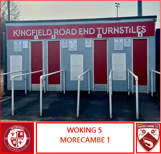 Today, Morecambe made the 268-mile journey to the Kingfield (a.k.a. the Laithwaite Community) Stadium in the London commuter belt of Woking, not for the first time. But your guess is as good as mine as to on how many other times they have made this journey in the past: the internet suggests numbers ranging from three to six and I have no way of checking these.