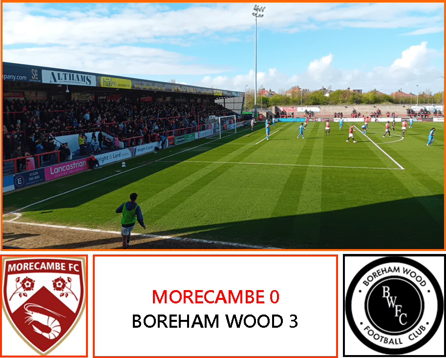 Another traumatic season in the history of Morecambe Football Club ended at least as far as home fans were concerned today. Boreham Wood made the long trip north from the London suburbs to visit the Mazuma Mobile Arena for the first time ever. With the Shrimps’ third relegation in four years already assured, it could be a very sobering thought wondering when the two clubs’ paths might cross again in the future…